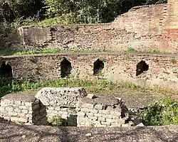 The laconicum (dry heat room) or sudatorium (steam room) is the most attractive and monumental building of the site, owing to its intact state and unusual form. It is elliptical in plan with four semicircular niches and with three internal floor levels. The underground tunnel which goes to the centre of the room is the access for heating the building via the hypocaust. The subfloors supporting the small piers for the suspended floors are at two separate levels to match the high step within the laconicum. The internal elliptical wall supported the upper floor at the level of the north door. Although laconica are fairly common in the imperial period, the originality of this design is notable and similar only to the Forum Baths at Ostia Antica and the so-called Heliocaminus Baths at Hadrian’s Villa.
