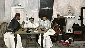 Pippin's genre paintings are among his most popular works; see, for example, the Domino Players (1943), in The Phillips Collection, Washington, D.C., and several versions of Cabin in the Cotton. Some, including After Supper (c. 1935–1939) and The Milkman of Goshen (1945), relate to his childhood in New York State. Views of the everyday activities of Black families "tended to be relatively invisible to the white masses" before the Great Migration, so Pippin's domestic scenes offered a privileged view.[7]