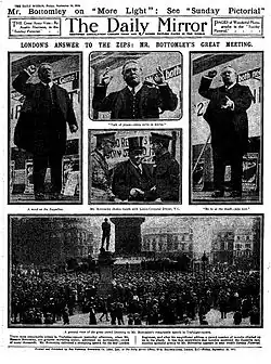 During the war, in his self-appointed role as spokesman for the "man in the street",[91] Bottomley addressed more than 300 public meetings, in all parts of the country.[92] For recruitment rallies he provided his services free; for others, he took a percentage of the takings.[93][n 5] His influence was enormous; the writer D. H. Lawrence, who detested Bottomley, thought that he represented the national spirit and that he might become prime minister.[95]