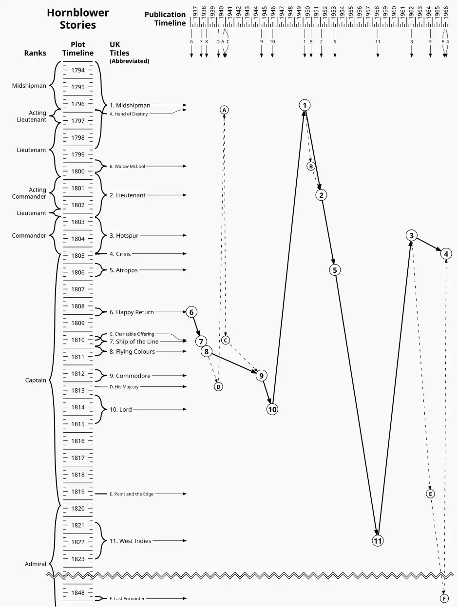 Another short story, "The Point and the Edge", is included only as an outline in The Hornblower Companion. The following diagram shows the relationship between the dates of the stories' action and of their publication.