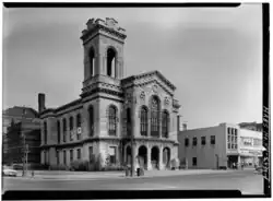 In 1867, White designed the original Onondaga Savings Bank (now the Gridley Building).[5] White adapted this style to the Hall of Languages, the first building constructed on the campus of Syracuse University. White was engaged to design New York State armories in Syracuse, Dunkirk and Ballston Spa. He also designed Plymouth Congregational Church in Syracuse. White prepared designs for over 100 churches.[3][5]