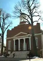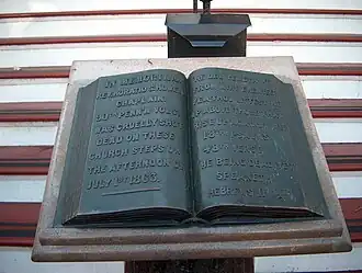 A monument at the foot of the College Lutheran church steps was dedicated in 1889 to mark the spot where the chaplain was killed.[5] The inscription reads
