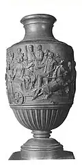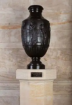 To memorialize the preservation of the American Republic following the Civil War,[22] in 1870 Congress appropriated $10,000 for the creation of a work of art for the Rotunda of the U.S. Capitol.[23] Stone proposed a set of three heroic-sized bronze vases, decorated with vignettes from American history. He was awarded the commission, and modeled the vases in Italy.[22] Stone returned to the United States in 1871, and his plaster models were cast in bronze by the Robert Wood Foundry in Philadelphia.[24] Soon after this, it was discovered that Stone had failed to return his signed contract for the commission, and the money appropriated by Congress had reverted to the U.S. Treasury.[22] He turned to art patron John Chipman Hoadley, who paid Stone's expenses, and the pair of smaller vases were installed (on loan) in the newly-built House of Representatives Chamber.[24] Ownership of the three vases reverted to Hoadley after Stone's 1875 death,[24] and they may have been among the bronze vases by Stone posthumously exhibited at the 1876 Centennial Exposition in Philadelphia.[25]