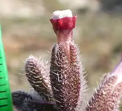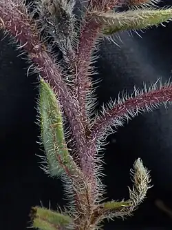 A distinctive biennial, 5 to 20 cm (2.0 to 7.9 in), hispid, with linear leaves, resembling an Anchusa with red tube-like flowers.[1]