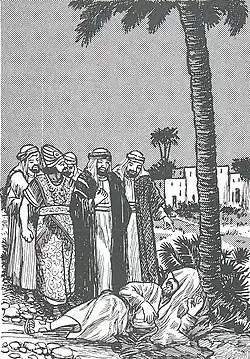 ![]() Hormuzan being brought before caliph Umar, who is found sleeping soundly in the shadow of a palm tree. | |