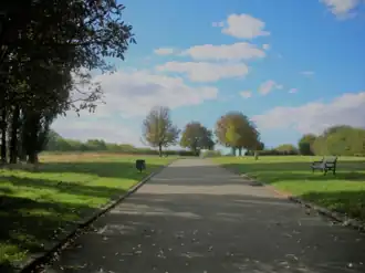 In the late 1940s Gaveston Crescent was laid down as a new street with prefab houses all the way along it on both sides, leaving the last bit of open land to the south of the new Horn Park estate only 50 m (55 yd) across.[24][25][12] The last section of the orchard still remained, north west of the current park, this was cleared and turned into houses and flats of Gaveston Crescent. In 1968 the prefab houses of Gaveston Crescent were torn down[24] and turned back into open land, making the park its current size of 16 acres (6.5 ha), and 120 m (130 yd) across.[4] The children's playground was constructed on the site of some of the former prefabs and the paved road surface of Gaveston Crescent itself was left running through the park as a large footpath, and still appears named on maps, despite having no houses and not being accessible by vehicle.[4][13] In January 2003 a newly constructed skate park was open to the public, and was the first skate park in the Royal Borough of Greenwich.[8] A local chairwoman, Frances Walker, raised £50,000 for outdoor gym equipment to be installed in Horn Park, shortly before she died April 2009 aged 69; the outdoor gym was installed in 2009, and a memorial sign with Walker's name and photograph was erected next to it.[26]