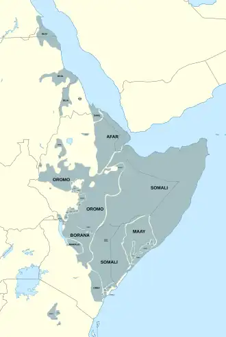 According to Ethnologue, there are 10 individual languages spoken in Djibouti (two native), 14 in Eritrea, 90 in Ethiopia, 15 in Somalia (Somali being the only native).[116] Most people in the Horn speak Afroasiatic languages of the Cushitic, Semitic, or Omotic branches. The Cushitic branch includes Oromo, spoken by the Oromo people in Ethiopia, and Somali, spoken by the Somali people in Somalia, Djibouti, Ethiopia and Kenya; the Semitic branch (specifically the Ethiosemitic sub-branch) includes Amharic, spoken by the Amhara people of Ethiopia, and Tigrinya spoken by the Tigrayan people of Ethiopia and the Tigrinya people of Eritrea. Other Afroasiatic languages with a significant number of speakers include the Cushitic Afar, Saho, Hadiyya, Sidamo and Agaw languages, the Semitic Tigre, Arabic, Gurage, Harari, Silt'e and Argobba tongues[117] as well as Omotic languages are spoken by Omotic communities inhabiting Ethiopia's southern regions. Among these languages are Aari, Dizi, Gamo, Kafa, Hamer and Wolaytta.[118]