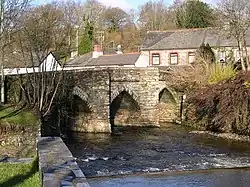 It sits on the River Walkham, a fishing river famous for its salmon. The village's name may have been taken from the 15th century pack-horse bridge which remains the only vehicular route from one side of the village to the other, and featured in the children's television programme Bagpuss.[3][4] The bridge is a Grade I listed building.[5]