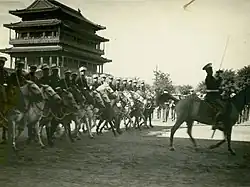 The United States Marine Corps later formed a mounted detachment of horse Marines in Peking, China, as a courier service during the 1911 Revolution.[3] When the Marines assumed Legation guard duty in 1905, they took possession of a quartermaster compound with a corral and stables plus 31 halters and assorted horse tack from the 9th Infantry.[4] After training with donkeys, Marines on M1859 McClellan saddles rode Mongolian horses weighing 650–725 lb (295–329 kg) and standing about 13 h (1.3 m) high. Marines weighing no more than 170 lb (77 kg) were selected for their knowledge of horsemanship. The detachment of sixteen men was designated a unit of the American Legation Guard in February 1912.[3] In support of their primary mission of rescuing Americans in distress outside of the Tartar Wall,[4] the horse Marines kept in contact with Americans living in or near Peking by conducting an annual census updated with weekly checks. In addition to an M1911 pistol, mounted Marines were the last American military unit to actually use the Model 1913 Cavalry Saber. When disbanded on 20 February 1938 following outbreak of the Second Sino-Japanese War the detachment had grown to 32 men armed with eight Browning Automatic Rifles, three Thompson submachine guns, twenty M1903 Springfield rifles, and an M1917 Browning machine gun. Notable commanders of the detachment included James Devereux and Chesty Puller.[3]