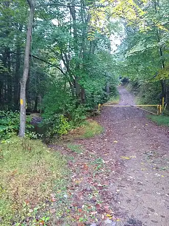 The Horse-Shoe Trail is traditionally described in the westbound direction. It begins in Valley Forge National Park and heads west, traversing historic battlefields from the Revolutionary War.[5] After leaving the national park, the route follows a variety of rural roads, with some wooded and undeveloped segments. In northern Chester County, the trail passes the Wharton Esherick Museum. It subsequently winds through the Hopewell Big Woods and Welkinweir arboretum, and later reaches the Hopewell Furnace National Historic Site.[6] After entering Berks County, the trail follows a meandering route through French Creek State Park.[7] After utilizing a rural road's overpass to cross Interstate 176, the trail proceeds through scenic farming areas in southern Berks County and northern Lancaster County with relatively little road walking.[8] In this area it also passes through Middle Creek Wildlife Management Area.[9]