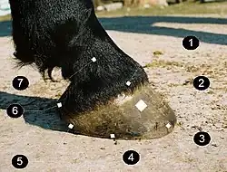 Quarter cracks are vertical splits in a hoof wall, most commonly seen on the inside of the front hooves or the outside of the hind hooves. They can result from poor shoeing and management practices, natural hoof conformation, or injuries to the leg and hoof.[5]