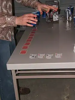 Before the game begins, each player makes bets based on their horse being as simple as "five on diamonds" but can get as complex as any true horse race such as trifectas, exactas, daily doubles, and others. In another variation, players may simply pick their favorite horse, and the payout is set at 20 drinks for the first-place horse, 15 for second place, and 10 for third place.[1] Placing a small bet on the "first horse out of the gates" is a popular bet that excites the crowd early. Penalties may be applied to bettors who bet on an ace that never leaves the starting gates. Safeguards are often instituted to prevent players from placing exorbitant bets such as "one hundred on hearts." Such safeguards may include setting bet limits, requiring players to drink a portion of their bet before the race begins, or forcing losers to drink a portion of their bet at the end.[2][1]