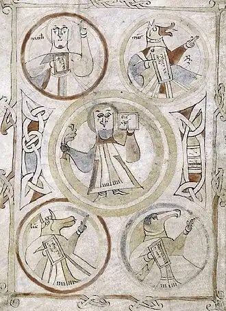 The confusion between the first name Marc and the name of the horse in Breton (marc'h) may have prompted Breton monk illuminators to depict Mark the Evangelist with a horse's head (instead of the usual lion's head) in several miniatures from the Gospel of the Saint, produced at Landévennec Abbey.[70][109] However, this theory is not universally accepted.[110]