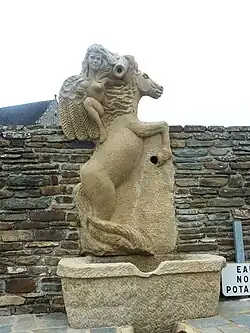 Celtic coins often feature horses, and the Venetes, Namnetes, Coriosolites and Riedones created coins with chariots, as well as naked riding goddesses.[111] A Venetes coin from the late 1st century B.C. features a charioteer on a chariot, pulled by an anthropomorphic horse with a human head, flying over a winged monster. It could be a kind of logo, originating in an important memorial date for the Venetians, probably that of an equinox, and linked to the sculptural group of the rider with the anguiped.[112] The figure of the horse with a human head is unique in Armorica, suggesting a possible error by the engraver.[113]