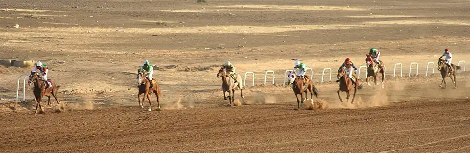 Betting is prohibited in horse racing, in accordance with Islamic laws.[2] The racing season takes place from October to June, due to the heat.[2] People suspected of betting despite the ban are regularly arrested.[2] Sudanese jockeys, renowned for their courage and combativeness, are recruited by racing stables in Gulf countries.[2] In 2012, the African Union proposed the organisation of horse races in Nyala, in South Darfur, as a factor of cohesion and peace between peoples.[5] Maintaining the races also supports cohesion and morale among the Sudanese population of Khartoum since the secession of South Sudan.[26]