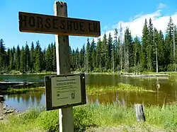Horseshoe Lake is a lake situated in the east side of the Midway High Lakes Area below Mount Adams's northwest flank. The lake is popular for camping, quiet boating (electric motors or canoeing), hiking, and biking on a trail halfway around the lake. Other activities include scenic viewing and fishing.[3] The lake offers an eleven-site campground, administered by the Gifford Pinchot National Forest in the State of Washington.[4]