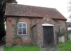 The Horsham chapel is a "plain, cottage-like building" which forms part of a group of old vernacular buildings on the west side of the Worthing Road—including Horsham's Quaker Friends Meeting House.[7][26] It has walls of red and blue-grey brick, two storeys and a hipped roof (with a hidden central depression) laid with Horsham Stone tiles.[7][14][20] The main façade faces east, and sits on a brickwork plinth with a stone course. A similar band separates the lower and upper storeys.[14] The date of construction is etched in one of the casement windows.[20] The central porch dates from the late 19th century.[14] The rear (west) wall is obscured but retains its original ground-floor paired arched windows and first-floor gallery windows. The north and south walls have single-window ranges; those on the south side are hidden behind the baptistery and vestry built in 1772. These are in the form of a lean-to with a sloping tiled and gabled roof and an arched window.[14] Writing in 1914, one architect stated that "to a casual glance, the chapel ... might very well be a detached private house".[24]