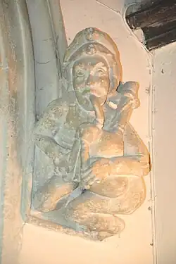The Church of England parish church of Saint Giles seems to have been built late in the 12th century. The Early English Gothic[7] south aisle, including the south door and three and a half bay south arcade date from this period. From this time the east wall of the chancel had a trio of three stepped lancet windows. The early Decorated Gothic south transept was added late in the 13th or early in the 14th century[7] as a chantry chapel. The south porch was added late in the 14th century.[3] Around 1400 the present west tower and tower arch were built. The tower arch features two unusual almost life-size sculptures of human figures: one playing the bagpipes and the other showing an expression of amazement.[7] Also in the 15th century the pitch of the nave roof was greatly reduced in typical Perpendicular Gothic style.[7] Late in the 15th century, Perpendicular Gothic windows were inserted in both sides of the chancel and the north wall of the nave. The Perpendicular Gothic piscinae in the chancel and south transept are also 15th century.[3]