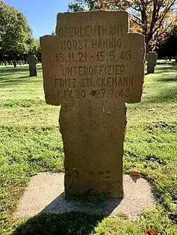 The Royal Air Force (RAF) targeted the Caen-Carpiquet Airdrome on 15 May 1943. Defending against this attack, elements of I. Gruppe intercepted the RAF fighters and claimed four aerial victories, two of which were not confirmed. Hannig was credited with the destruction of a Spitfire shot down east of Troarn, his 98th aerial victory.[42] In this engagement JG 3 lost four aircraft with three pilots killed in action, including Hannig.[43] He was shot down in his Focke-Wulf Fw 190 A-4 (Werknummer 0734) near the airfield at Rocquancourt.[44] His victor was Squadron Leader J. Charles leading Yellow Section of No. 611 Squadron. He had managed to bail out but his parachute failed to open.[45][46] Hannig was posthumously awarded the 364th Knight's Cross of the Iron Cross with Oak Leaves (Ritterkreuz des Eisernen Kreuzes mit Eichenlaub) on 3 January 1944 and posthumously promoted to Oberleutnant (first Lieutenant). He was interred at the Saint-Désir-de-Lisieux German war cemetery.[47] He was succeeded by Oberleutnant Karl Haberland as commander of 2. Staffel.[39]