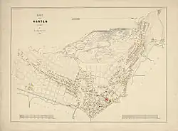 The development of the town of Horten is closely related to the Royal Norwegian Navy's activity in the area. By royal decree in 1818, Horten was designated as a military station similar to Fredriksvern (now called Stavern). The new naval harbor was to be built in the bay that is surrounded by a small peninsula and several islands. The navy's main shipyard was also built at Horten. In 1855, the entire naval facility was named Karljohansvern. Horten was designated as a ladested in 1857, which separated it from Borre Municipality and made it a self-governing urban municipality. In 1864, the naval school was transferred from Fredriksvern to Horten. In 1907, the small town was designated as a kjøpstad. The naval facility was located at Karljohansvern until 1940. During World War II, the Battle of Horten Harbour took place just offshore from the town of Horten. On 23 February 1945, the Nazi-occupied Karljohansvern base was bombed by British aircraft and the shipyard was completely destroyed. The base was rebuilt as a civilian state-owned company in 1948 (it closed in 1987). In 1960, the naval school was moved to Bergen. In 1963, the navy's main base was moved from Horten to Haakonsvern near Bergen. The naval officer's school was located in Horten until 2009, when it was also moved to Bergen. Now, there is the Royal Norwegian Navy Museum at Karljohansvern.[4]