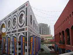 Horton Plaza was a five-level outdoor shopping mall in downtown San Diego, California. It was designed by Jon Jerde and was known for its bright colors, architectural tricks, and odd spatial rhythms, occupying 6.5 city blocks adjacent to the city's historic Gaslamp Quarter. Opening in 1985, it was the first successful downtown retail center since the rise of suburban shopping centers decades earlier.[2]