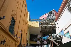 Local developer Ernest Hahn signed an exclusive negotiating contract in 1974 and purchased the land for US$1 million in 1978, conditioned on building parking garages.[6] Hahn also specified numerous improvements required in downtown San Diego before he could start construction, including the completion of the San Diego Trolley, the approval of the San Diego Convention Center, and the establishment of the Centre City Development Corporation.[18] In August 1979, the city council approved Hahn's plans to proceed with the construction of Horton Plaza, starting with the relocation of many businesses and the demolition of several historic structures, including the Lyceum, Cabrillo, and Plaza Theatres[a] and the Horton Grand Hotel;[18] several buildings that were on the National Register of Historic Places were removed and/or relocated to make way for the planned retail center.[b][24] Due to numerous setbacks and resistance from preservation groups, construction did not begin until 1982.[25]