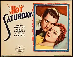 Hot Saturday is a 1932 American pre-Code[1] "programmer"[2] drama film directed by William A. Seiter and starring Cary Grant, Nancy Carroll, and Randolph Scott.[3] This was Grant's first role as a leading man. Based on the novel Hot Saturday by Harvey Fergusson, the film is about a pretty, virtuous, small-town bank clerk who becomes the victim of a vicious rumor.[4][5]