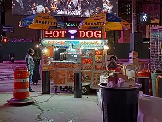 A hot dog cart is a specialized mobile food stand for preparing and selling street food, specifically hot dogs, to passersby.[1] In some jurisdictions, a cart operator must meet stringent health regulations designed to protect the public. Hot dog carts are quick and easy food services, supplying millions of people with food every day. In 2015 the U.S. Hot Dog Council estimated that 15% of the approximately 10 billion hot dogs consumed by Americans in 2014 were purchased from a mobile hot dog vendor cart.[2][3] Hot dog carts are very common in New York City,[4][5] and most of the hot dogs purveyed by hot dog carts in New York City are sourced from Sabrett.[1]