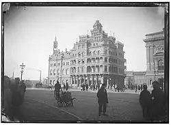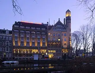 The first American Hotel was built on the Leidesplein in 1882. Designed by architect Cornelis Steinigeweg, it shared the block with a police station and a fire station.[2] It closed in 1900 and the entire block was demolished for construction of the current structure, built from 1900-1902 to designs by W.Kromhout and H.G. Jansen in the Berlage style. In 1927–1928 an expansion was built, designed by architect G.J. Rutgers in collaboration with K. Bakker.[3] Both the expansion and the café are National Heritage sites.[4] The hotel was extended again in 1954.