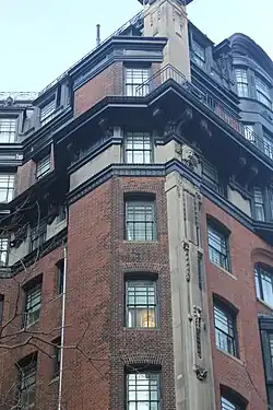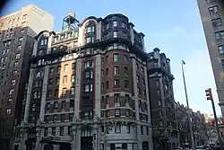 The facade is largely made of red brick with ornamentation made of limestone, metal, and terracotta.[13][20] This contrasted with later buildings by Roth's firm (including the San Remo), which generally contained buff-brick and limestone facades.[21] Both the Broadway and 77th Street elevations of the facade are divided horizontally into three sections: a two-story base, a six-story midsection, and a two-story capital. the third through seventh stories are largely clad with brick; and the ninth and tenth stories form a mansard roof.[13][20] The southern and eastern elevations are largely clad in plain brick and contain windows; the southern elevation is a party wall abutting another building.[22]