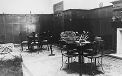 The hotel itself produced a 12-page brochure about this time which included black-and-white photographs of the interior: on the ground floor the lounge had gleaming copper-topped tables, deep leather lounges and chairs and led to a writing room and telephone booth; the dining room, enticing in its cleanliness, was capable of seating 150; the private bar which gave exclusive service amidst convivial surroundings was screened from the public bar by an ingenious arrangement a French polished oak partition with mirrors; the public bar was very modern and luxurious and a cool cement court-yard formed an entrance to the ball-room. Upstairs all accommodation rooms opened onto the verandah – some were equipped with their own bathrooms designed to please the most fastidious, and the upstairs lounge was just the place for a real restful smoke. Corones Hall located on Galatea Street had a floor unexcelled outside Brisbane and was largely in demand for exclusive balls, parties, and banquets. Capable of seating 320 at dinner, the hall was built for coolness with a number of high-set windows and electric ceiling fans. The lights with Venetian shades of various hues were adjustable either to dimness or the reverse, and an orchestra platform added to its popularity and beauty.[1][2]