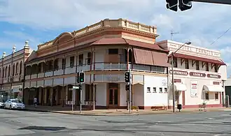 The two-storeyed verandah is supported on posts, the cast iron body of which sits on a timber base and is also extended through the frieze in timber. The truncated corner of the building is emphasised by pairs of columns flanking the corner entrance, extending through to the floor above. The ground floor verandah frieze is of plain timber slats with feature fretwork slats, below which are diagonally cut timber panels. One bay of the ground floor verandah space has been infilled with rendered and scribed brickwork. The verandah to the upper floor has an ogee curved profile awning, balustrading of similar detail to the frieze below, and slatted timber brackets and frieze. A rudimentary rear verandah is accessed by a straight timber stair.[1]