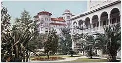 Construction on a hotel was initiated in 1887 by developer Edward C. Webster, between Raymond Avenue and the Santa Fe Railroad tracks. Webster's later insolvency led to George Gill Green acquiring the unfinished building.[5]: 10 Green doubled the size and completed the hotel in 1893. The newly expanded hotel, named the Hotel Green, opened for business in 1894.[5]: 12 During its time, the Hotel Green became a "social and cultural center for Pasadena," where it hosted society events such as receptions for significant visitors,[5] and painting exhibitions.[6] Due to the hotel's success, Green began building an addition in 1897, and the "Central Annex" opened on January 16, 1899, to coincide with Green's birthday, and 1,000 guests came to celebrate the occasion.[5]: 12 The new building, to become known as "Castle Green," was on a full city block but was "set back from the streets, which provided ample space for a garden."[5]: 13