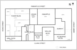 On Clark Street were three structures. Just west of the St. George Hotel were the Weller and Marquee buildings, respectively; both measured 50 feet (15 m) wide and 85 feet (26 m) deep. The Weller Building was four stories tall, while the Marquee Building was twelve stories tall; fire doors separated the Weller and Marquee buildings.[9] To the west of the Marquee Building was the Clark Building, a 10-story building, was located at 51 Clark Street with a frontage of 75 feet (23 m) and a depth of 90 feet (27 m). At one time, the Grill and Clark buildings had been connected at each floor level with overhead rolling fire doors at the openings, but the doorways were sealed on the Grill Building side when the Clark Building closed. A one-story covered courtyard was located near the western end of the middle of the block.[5] The Clark Building was destroyed in a fire in 1995.[3]
