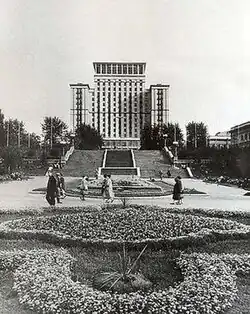 For central Kyiv this had a full impact on the final stage of its reconstruction. The original project of Dobrovolsky was abandoned, which upon the late 1950s was mostly complete, with the exception of the northeastern side of the Kalinin square. Construction was stopped, and the square, for almost two decades looked very odd with the asymmetry formed from the rich Stalinist buildings on the north and the old pre-war, and pre-revolution constructions opposite.