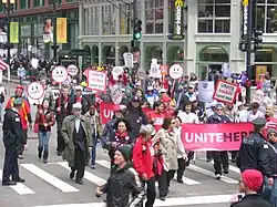 UNITE HERE has allied with LGBT rights activists creating the "Sleep With the Right People" slogan and collaborating on projects of mutual interest. The groups orchestrated a successful joint campaign (which involved a "Kiss-In" as well as a boycott)[4] against the San Diego Grand Hyatt, whose owner Doug Manchester was a major supporter of California Proposition 8.[5] (GOProud, a conservative gay organization, criticized the "gay left" for its "slavish loyalty to big labor".)[6]