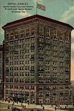 Following the war, Atlanta rebounded and began to rebuild at a rapid pace. New hotels arose to replace those lost during the war, including the Kimball House (1870) and the Markham House (1875). While many of the hotels before and after the war were built around State Square in downtown Atlanta, by the 1890s many of the newer hotels were being built north of the area along "upper Peachtree". Some of these notable buildings included the Majestic Hotel (1898) and the Piedmont Hotel (1903).[6][7] Also starting around this time, several hotels opened on Hotel Row near the newly opened Terminal Station in South Downtown. Among these was the Terminal Hotel, built in 1906 by prominent Atlanta businessman Samuel M. Inman.[8] However, stiff competition from other hotels in downtown caused the area to experience a decline a few decades later.[9]