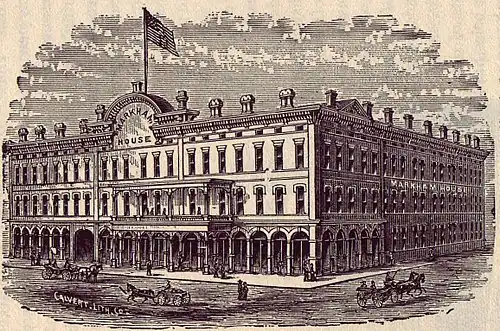 The White Hall Inn, located in present-day West End, Atlanta, is generally considered to be one of the first hotels in the area, predating the founding of the city by several years and laying outside the original city limits.[1] As the area's population began to grow following its establishment as a terminus for the Western and Atlantic Railroad in 1837, several hotels arose to service visitors to the city. The first hotel built within city limits came in 1846 with the construction of the Atlanta Hotel.[2] It was joined later that year by Washington Hall.[3] Several more hotels would follow, including the Trout House in 1849.[4] However, these buildings, as well as many other Antebellum era buildings in the city, were destroyed during the Burning of Atlanta, a significant event preceding Sherman's March to the Sea during the American Civil War.[5]