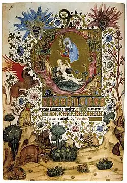 The Hours of Giangaleazzo Visconti (Florence, Biblioteca Nazionale, Banco Rari 397 and Landau-Finaly 22) is a Roman-liturgy, illuminated Book of Hours in Latin, which was commissioned by the ruler of Milan, Gian Galeazzo Visconti, in Italy in the late 14th century.[1] A Book of Hours is a personal prayer book that contained, in part, the Hours of the Virgin, a daily devotional that was popular at the time. This particular Book of Hours was created by two master illuminators, beginning with Giovannino dei Grassi before his death, and completed by Luchino Belbello da Pavia.[2]
