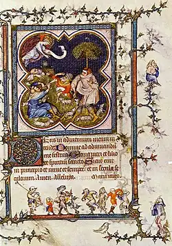 In the Gospel of Mark, it has been said that a young man ran away when Jesus was captured; academics have assumed that this is the boy hiding in the bush at the bas-de-page. The Gospel mentions his nakedness, which is not depicted here, however, this interpretation could be that he is looking for his shoes in the bush when he originally fled, as he is no longer wearing shoes.