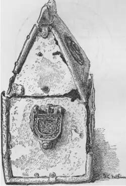 As well as relics, some Irish shrines were intended as receptacles for manuscripts, or perhaps as containers for the Eucharist.[18] It is thought that most ironwork reliquaries were commissioned in part as status symbols, and primarily to be housed in their home monastery or church, perhaps in front of the altar. House-shaped shrine were built to be portable, and were often moved from their fixed church positions for local processions, to collect church dues, for oath swearing or other diplomatic occasions, or less frequently as battle standards to protected the home troops and ask God for victory.[19][20] For this reason, the majority contain carrying hinges to which leather straps could be attached to be carried over the shoulder or around the neck.[10][21] The straps for the Lough Erne shrine, found in 1891 by fishermen,[22] is secured by separate cast escutcheons.[13][23] The inner core of most have lids used to access or display their relic.[20] Irish annals from the 8th and 9th centuries record shrines —later described as "reliquiae" or "martires" (martyres)— containing the corporeal remains of saints being carried from town to town by clerics.[24]