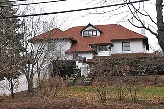 Boit's three houses were designed by local architect Harland Perkins. They were situated in an estate compound on the summit of Cowdry's Hill, that included three residences, formal gardens, a playhouse, and a greenhouse. All three residences, 90 and 88 Prospect Street, and 127 Chestnut Street (1910-1913), were designed in the English Cottage style. The stucco structures have red tile roofs, recessed entries, exposed purlins, and irregular fenestration. This house is 1+1⁄2 stories in height, with its entry set under a cross-gable roof section with a clipped gable. There are recessed porches on either side, supported by heavy columns.[3]