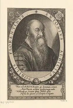 Antonio degli Albizzi (1547 - 1627) completed his studies in Pisa and became the regent of the Accademia degli Alterati. His life was marked by significant intellectual and political activity, as well as a notable conversion to Lutheranism that set him apart from many of his contemporaries. As a young man, Albizzi authored writings on Dante, composed Carnival poems, and penned a biography of Pietro Strozzi. In 1576, Antonio entered the service of Andreas von Habsburg, a young cardinal and member of the Habsburg family, and served as Andreas' secretary, counselor, and camerarius aulicus. Antonio's conversion to Lutheranism occurred around 1585 during his time as the Habsburg commissary in Carniola (Slovenia). The conversion was reportedly triggered by an illness and a Jesuit reading Paul's letters to him.[11]