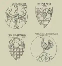 A new coat of arms seems to have been introduced by Poppo VII and first appears in 1237, and depicts the more familiar arms of a Hen standing on a mountain, where the hen and the mountain (Berg) are canting arms for the name Henneberg.[27]