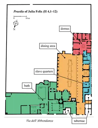 The House of Julia Felix,[1][2] also referred to as the praedia (Latin for an estate, or land) of Julia Felix, is a large Roman property on the Via dell'Abbondanza in the city of Pompeii.[3][4] It was originally the residence of Julia Felix, who converted portions of it to apartments available for rent and other parts for public use after the major earthquake in 62 AD, a precursor to the eruption of Mount Vesuvius in 79 AD that destroyed Pompeii.
