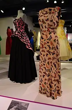 Elsa Schiaparelli opened an atelier in Paris in 1927. Her early designs were relatively conservative, with a focus on knitwear. Her business grew over time, employing 400 employees by 1932. Already a long-time collaborator with Man Ray, Schiaparelli began further collaborations with artists from the Surrealist movement in the mid-1930s, including Salvador Dalí, Jean Cocteau, and Leonor Fini. During this period, she came into what would become her signature quirky, surrealistic aesthetic. After the Second World War, Schiaparelli's star dimmed, overtaken by new couture designers such as Christian Dior. In 1954, the house declared bankruptcy.[2] Elsa Schiaparelli created a new company in 1957 to sell her perfumes, which is the actual company today.[3] She also went on promoting the perfumes and giving lectures.[4]