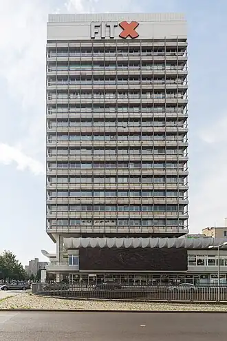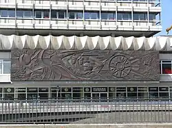 The House of Travel architecture is in the International Style, the skyscraper walls consist of Aluminum construction. The skyscraper is surround by a two-story base which consist of two slightly shifted structures, the roofs of which have unusual wave-like moldings which curve upwards. On the eastern facade of the building on the level of the second floor there is a copper relief work by Walter Womacka. It's named "Der Mensch überwindet Zeit und Raum" (English: Man Overcomes Time and Space).[3]