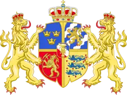 Écartelé à la croix pattée d'or, qui est la Croix de Saint-Eric, cantonnée en 1 et 4, d'azur à trois couronnes d'or posées 2 et 1 qui est de Suède moderne, en 2 et 3, d'azur, à trois barres ondées d'argent, au lion couronné d'or armé et lampassé de gueules, brochant sur le tout, qui est de Suède ancien, sur le tout, tranché d'azur et de gueules à la banche d'argent et à la gerbe d'or brochant sur le tout qui est de Vasa.[8][9] in English