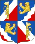 Écartelé au I et IV de gueules, à l'aigle d'argent, becquée, lampassée, membrée, liée et couronnée d'or, au II et III de gueules à un chevalier d’argent, portant un écu d’azur à une croix patriarchale d’or, sur le tout d'azur à trois fleurs de lys d'or in English,