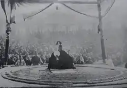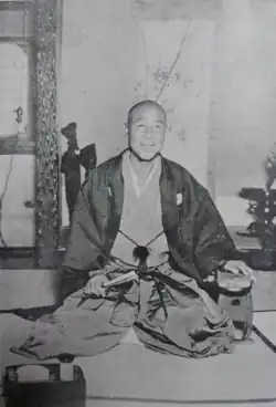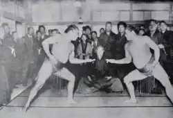 Since the fall of the Tokugawa shogunate and the establishment of the Meiji Restoration, the Gojō family of Kyoto began to thrive, taking advantage of the decline of the powerful Yoshida patrons, the Hosokawa clan.[8] They began to produce an incomprehensible abundance of yokozuna.[9] In 1877, the 23rd Yoshida Oikaze served again in the Satsuma Rebellion but was defeated and captured. With its leader in prison, the House of Yoshida was unable to oppose the appointment that same year of Yokozuna Sakaigawa, nominated by the Gojō family, and had to approve this choice.[8] Sakaigawa was promoted yokozuna during this period of turmoil, and he was the only yokozuna to be officially recognized at the end of that period of "overproduced yokozuna", also known as the "yokozuna abuse era" (横綱濫造時代).[9] In 1884, however, Umegatani I received a double license from the Yoshida and Gojō families at his request, resulting in the Yoshida family's survival.[8] The 23rd Oikaze of the Yoshida family continued to award official licences to yokozuna until the 35th, Futabayama, in 1937.[10]